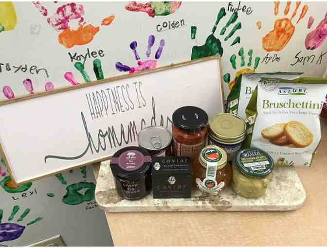 "Happiness is Homemade" sign, cheese board with a variety of gourment jellies and spreads.