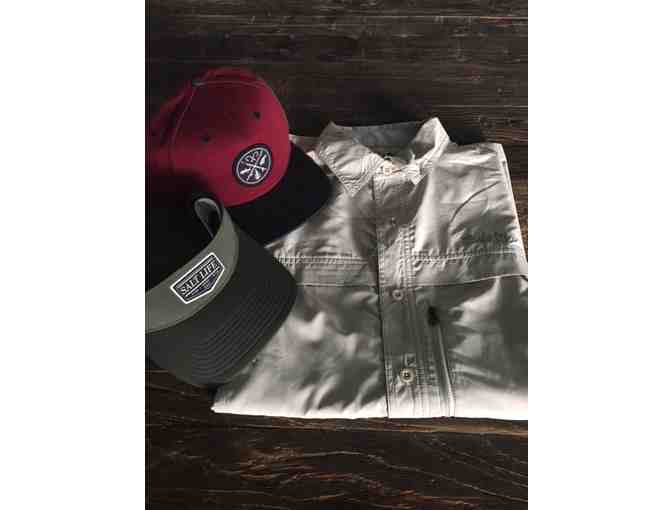 It includes: a Salt Life Angler performance short sleeve fishing shirt (Men's size Medium), a Salt Life Baseball Cap, a Salt Life Sun Visor and a salt Life Decal.