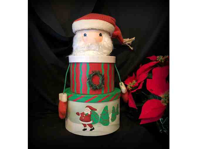 Three stacking Santa boxes measures 15" high, perfect to fill with treats for a gift or just to use as holiday decor around the home.