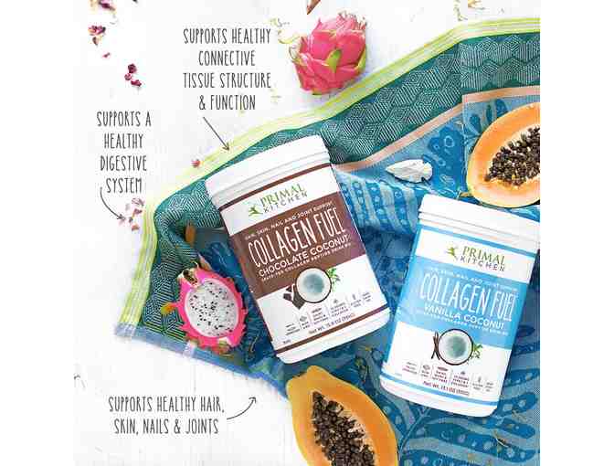 Enjoy these 2 Canisters of Collagen Fuel - (one vanilla and one chocolate) plus a Primal Kitchen Cookbook. Give your body's restorative powers a boost with Primal Kitchen Collagen Fuel protein shakes. Collagen is the most abundant source of protein in the human body and helps support joints, hair, skin, nails and connective tissues. Our Collagen Fuels contain coconut milk as the primary source of beneficial healthy fat, helping to take the edge off hunger for hours. So get ready to stir, blend and shake!
