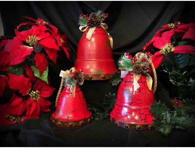 Metal Holiday Rope Hanging Bell Set. Large bell measures 12" high, medium bells measures 10" high and the small bell, 8" high.