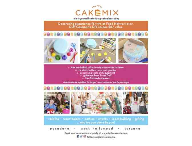 Decorating experience for two at Food Network Star Duff Goldman's DIY studio! Includes: one pre-baked cake for two decorators to share; fondant, buttercream, and goodies; decorating tools and equipment; guidance from Team Duff; and two finished cupcakes!