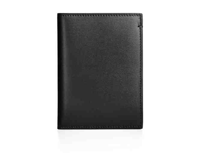 High-quality Italian leather and T-shaped accents define Tiffany leather designs. This classic piece is a necessity for any getaway. Black smooth calfskin leather; Three interior credit card slots, one open pocket and one passport pocket; Leather-lined; Made in Italy.