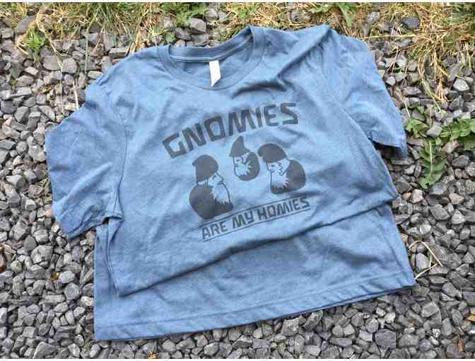 A must have! Enjoy a Summerfield T-shirt (Class Unisex Cut, Size Medium) in Heathered Blue with the motto "Gnomies are my Homies" on the front and the Summerfield logo on the back.