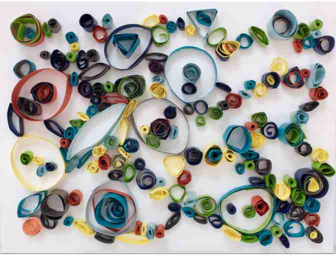 The class spent two days creating the quills, or rolls of paper.  After the quills were prepared we worked in groups of four to place the quills on the canvas.  Students selected the quill and its location on the canvas, so the final result is a true collaboration of the class.  We hope you enjoy it!