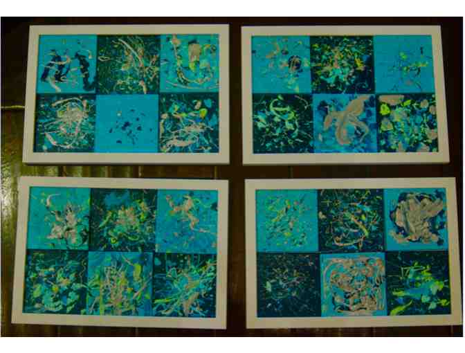 This piece is acrylic on canvas. Students used paintbrushes in unconventional ways and without letting the brush touch the canvas. The work celebrates each childs individual artistic expression while simultaneously celebrating the coming together of color, shape and pattern.