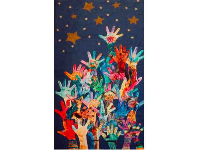 Multi-media hands reaching for the stars. Paper, water color, sharpie and modge-podge on canvas.