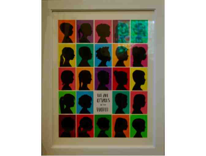 I wanted this piece to be personal and represent each kid without being too specific so I decided to get them to make cameos of themselves. I took photos of them and then showed them how to trace and transfer the image onto black card. I then cut these out and made a poster with all their silhouettes. We talked about how even though we werent going to be able to see so many of the things that they use to identify each other just these outlines were enough to be able to distinguish each of them as individuals. Their uniqueness was made visible to them in a new way and resulted in a striking example of the different shapes we all have while essentially being the same - Citizens of The World.