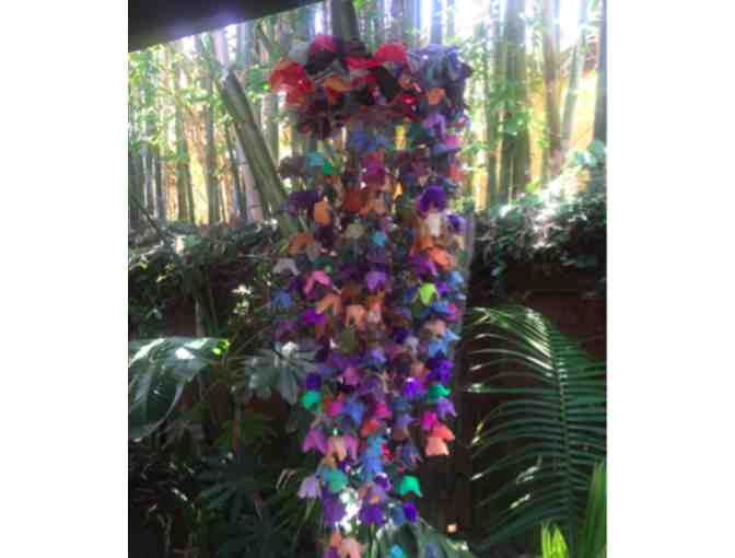 This piece is made of painted egg crates which were then strung using chicken wire & two pieces of bamboo. Fabric scraps were then weaved on top and the egg crates were covered in Modge Podge to lend it some durability. This piece that can be hung as ceiling decor in a kid's room, a play room, art room, or classroom.