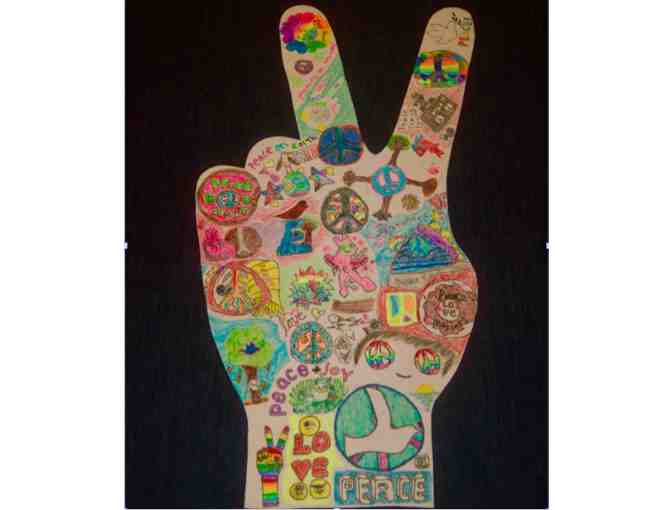 Fabric markers on canvas and denim. Using the iconic peace hand sign as a backdrop, students designed their take on peace in a multitude of playful ways.
