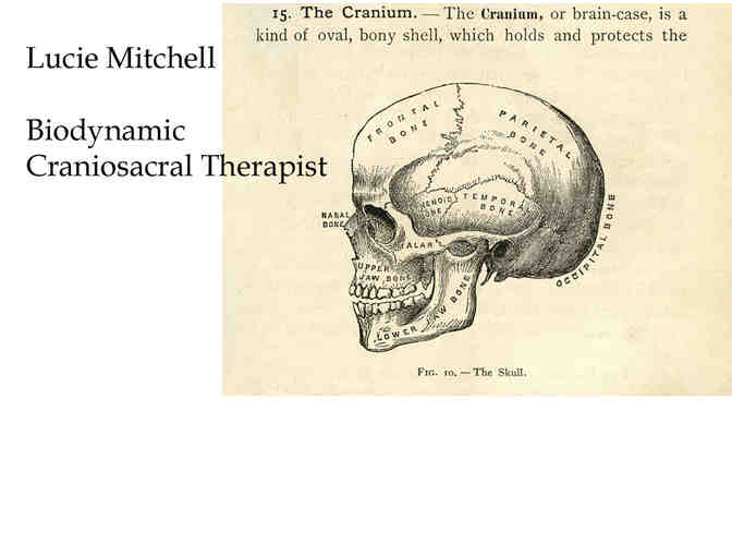 One craniosacral therapy session with Lucie Mitchell. Craniosacral therapy is an exceptionally gentle and effective hands-on therapy that facilitates the body's natural ability to heal. There are corresponding movements between the cranium (head) and the sacrum (base of the spine) and a "tide" of cerebral spinal fluid. The skill of the practitioner is to be able to perceive and listen to the rhythms of these movements. Then by correcting imbalances and releasing blocks from the craniosacral system, the body can reorganize into a more open expression of health and heal a wide variety of problems. Lucie's approach to this therapy is very accessible, honest and realistic.