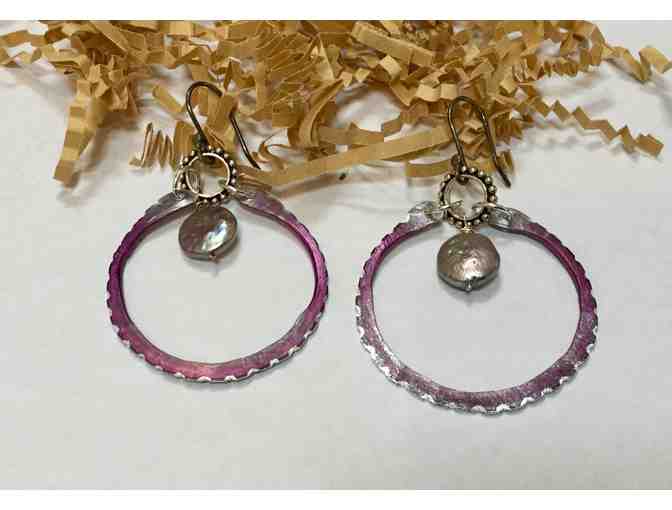 Created with the spirit of spring in mind these earrings are handmade with sterling silver findings, freshwater coin pearls and a beautiful hand hammered and formed hoop.