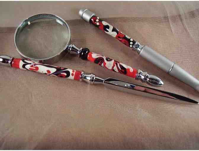 Classic beauty is evident in our unique executive gift set including a stylish pen, magnifying glass, and letter opener. Show your truly discriminating taste at the home or the office! Pens can be refilled with standard cartridges available at most office supply stores. The essence of Deb Rich's artistic expression is revealed in each lampwork bead that she creates in her studio. Deb's beads exhibit her desire to create and inspire change through community outreach. These jewelry pieces are offered exclusively through cMarket to support the fundraising efforts of non-profit organizations. Lampwork glass reflects both the heartfelt passion and interpretative expression of Deb Rich. Her artistic resume includes fantasy sculptures, creatively fashioned from found-objects and recycled materials. Deb's Glass Designs are truly hypnotic, one-of-a-kind pieces that cannot be replicated or manufactured by a machine, so items might vary slightly from the photo. Deb only sells jewelry pieces that capture the grace and flow of glass artistry. All jewelry is made with Bali style findings, Czech or Swarovski Crystals, and various complementary beads, making Deb's Glass Designs positively the best choice.