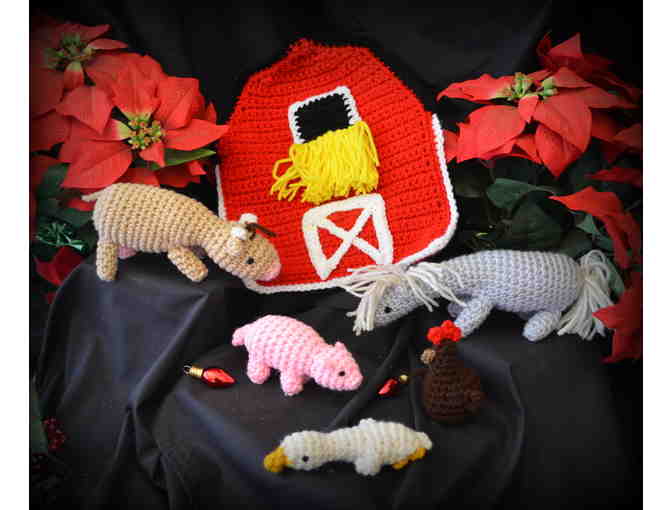 Hand-crocheted barnyard. Open the Barn and to let the crocheted horse, cow, pig and chicken come out and play.