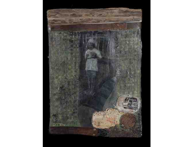 Port Clyde Sardine Factory by Otty Merrill. Mixed media. Encaustic over board with embedded photo from the Penobscot Marine Museum archives. 18" x 24".