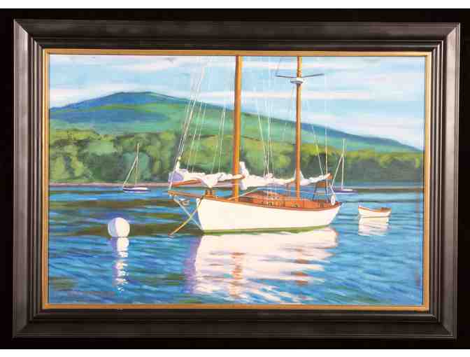 Herreshoff-Camden by R. Kirk Moore. Framed oil on canvas, 24" x 36". An acclaimed Maine artist, Moore’s works are shown at Synchronicity Fine Arts, NY and hang in collections throughout the United States, England, France, Switzerland, Australia, and Singapore. Value $7,200. - Anne Perry