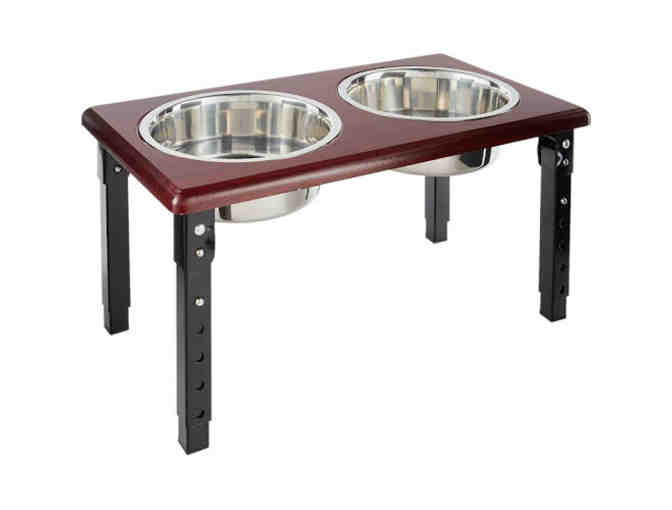 THis double diner (for food and water) comes with a cherry wood top and includes 2- two quart stainless steel dishes. Also has adjustable legs to adjust to the right height for your dog's posture
