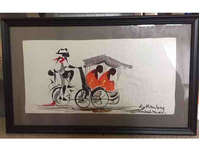 This painting by a Cambodian artist, Ly Kimleng, has beautiful brush strokes and vivid color. It depicts a bicycle taxi and his two passengers. Professionally framed, the overall size is approximately 8 x 18".