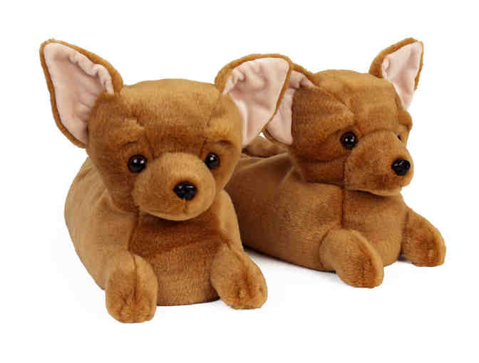 With iconic pointy ears, large expressive eyes, and a dainty muzzle, these fawn-colored Chihuahuas are sure to charm! Made with super soft plush uppers, sturdy foam footbeds and non-slip grips on soles.