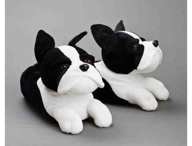 Who can resist a Boston terrier? These black and white pups are as cute and cuddly as the real thing! Our soft plush slippers capture the pointed ears, distinctive muzzles and warm brown eyes of this intelligent breed. With a full foot design, these slippers are made with soft but supportive foam footbeds, and no slip grips on soles.