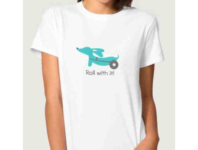 Celebrate the tenacity of our disabled dachshund friends with this ladies size large "roll with it" shirt!