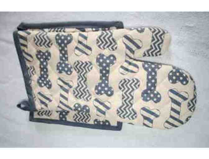 Brand new with tags. Blue and ivory dog bone motif pot holder and oven mitt set. Go ahead, dress up your kitchen!