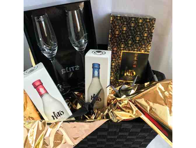 Hiro Sake: Black and Gold Basket with Hiro Sake Products and Glassware