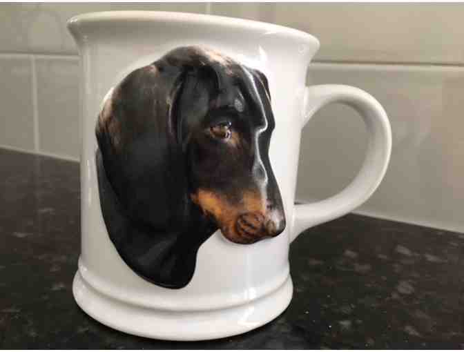 This is an embossed coffee mug with your favorite dachshund as a 3D raised image on the side of the cup. It stands 3 3/4'' tall and is 3 1/2'' wide at the brim. If you look at the pictures, there is a very shallow chip on the bottom which is hardly detectable except from the bottom of the mug. On the reverse of the mug is DACHSHUND. Please bid high for AADR! Only $1 added to you buy-it-now or winning auction bid to defray the cost of shipping!!