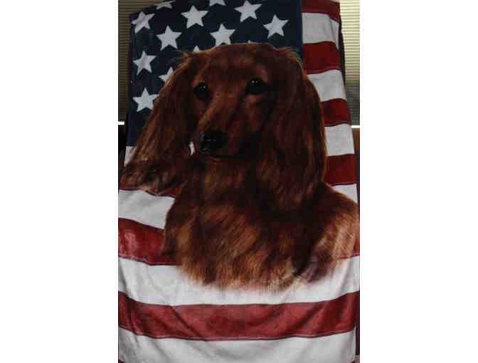 Micro-fiber beach towel with flag and red long-hair dachshund, size 29" x 60"