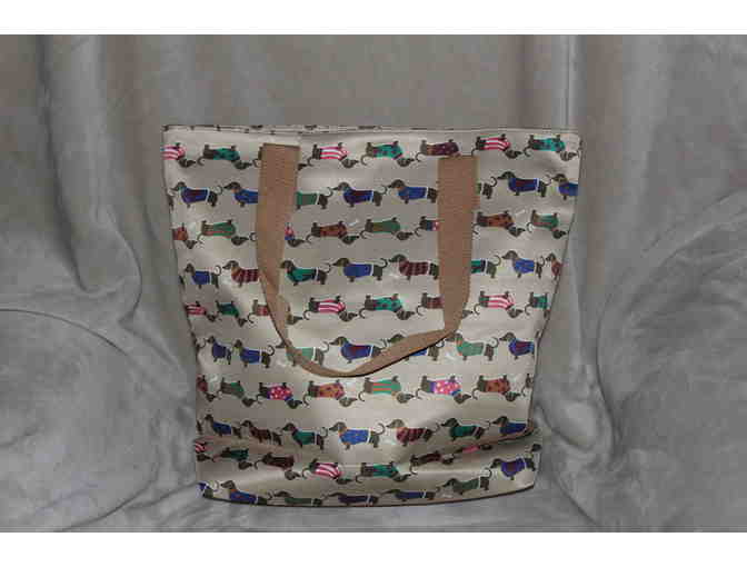 Medium size canvas tote bag, 13.5" high x 14.5 " wide. Tan background with dachshunds in sweaters design, zipper top.