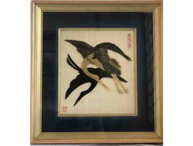 Made of tortoise shell, this picture and picture frame is traditional and beautiful. You are sure to love detailing of the tortoise shell that makes up the larger image of the cranes.