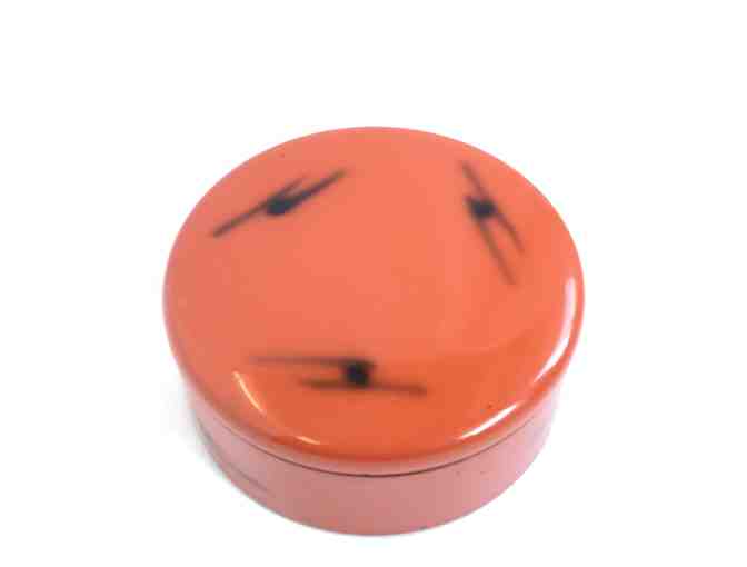 This circular jubakko is orange with black brush strokes and two layers. Store candies, little foods or trinkets inside the multiple layers or display in your home.