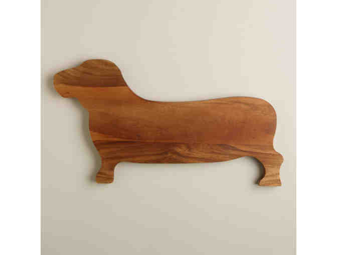 Is this not the cutest addition to your kitchen??? For use or for display?? Crafted of acacia wood, this adorable Dachshund Cutting Board provides a durable cutting surface with the rustic appeal of natural wood grain. Crafted of acacia wood Hand wash only Measures 18"W x 10"L x .75"H. The bottom has little 'feet' so that it won't slide on your counter when used as a cutting board. This was a World Market item from several years ago. Who missed out on this awesome cutting board????