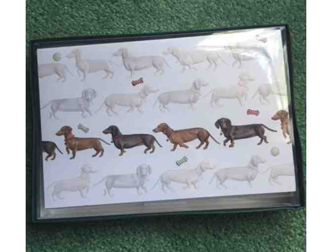 • Beautiful Brown and Black Dachshunds on card with colorful green and red bones on outside of card.