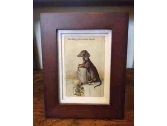 5 x7" framed postcard featuring dachshund with turnip and stein, from early 20th century. Postmarked Babenhausen.