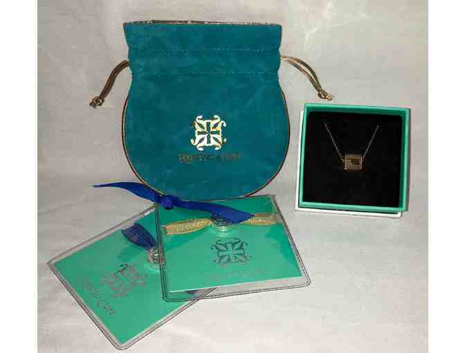 Gold pendant necklace features the state of Oklahoma on one side of the cube, and the Rustic Cuff logo on the other sides. 19" chain includes a 2" extender. Included with this necklace is a set of two RC hair ties in gold and royal blue.