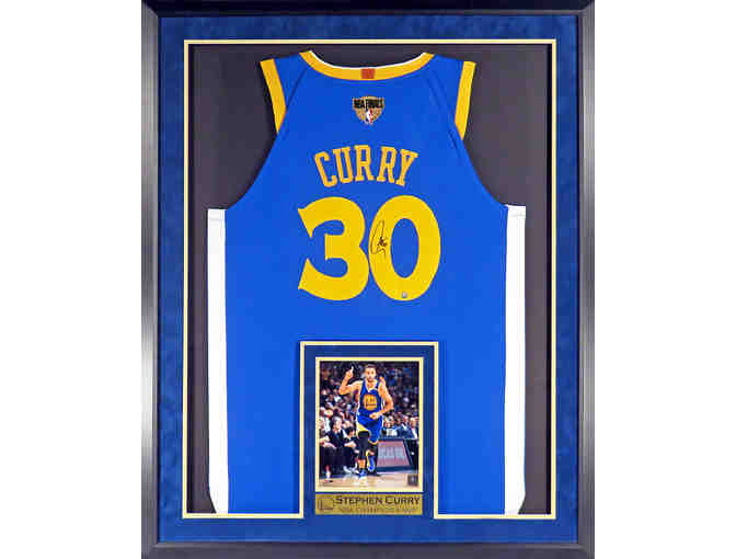 Before Stephen Curry even played a college game, head coach Bob McKillop said at a Davidson Alumni event, "Wait till you see Steph Curry. He is something special." Was Coach McKillop ever right! Curry went on to become Davidson's all-time leading scorer and collected too many Awards and Honors to mention them all. On June 25, 2009, he was selected 7th overall in the 2009 NBA Draft by the Golden State Warriors...and the rest, as they say, is history. Stephen had a great rookie season, finishing 2nd in NBA Rookie of the Year voting and winning a Gold Medal as part of Team USA at the FIBA World Championships. And in 2012/13, all Steph did was lead the Warriors to the Postseason (and First Round upset of the Nuggets) for only the 2nd time in 13 years. Fast-forward to today and Steph is not only a 2x NBA MVP (the NBA's 1st unanimous selection in 2015/16), but also a 3x(!) NBA CHAMP (beating LeBron & the Cavs ALL three times)?! And arguably one of the most popular athletes on the planet...take that LeBron! This new style Warriors Blue Jersey w/ Official 2018 NBA Finals Patch is hand-signed by Steph and Sports Gallery Quality Framed with our signature jersey framing of wood moulding, UV-protective glass, Suede double-matting, inset action 8x10 photo and SGA Exclusive "CHAMPION & MVP" Plate. A great can't miss collectible...and Sports Art...from one of the greatest basketball players on the Planet.