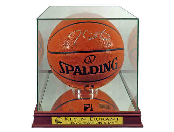 Kevin Durant became a Golden State Warrior in 2016? Seriously? So Curry, Thompson & Green weren’t enough of a force? A force that not only won an NBA Championship but broke the NBA Single Season record for wins in a season…73. What is that saying about the “rich getting richer?” Kevin is, of course, one of the best players in basketball. Durant has won an NBA Most Valuable Player Award, multiple NBA scoring titles, NBA Rookie of the Year Award, and an Olympic gold medal. He has also been selected to too many All-NBA and All-Star teams to count. A native of Washington DC, Durant played his college ball at Texas where he was the first ever freshman to be named Naismith College Player of the Year. In the 2007 NBA draft, he was selected with the second overall pick by the Seattle SuperSonics. After his rookie season, the team relocated to Oklahoma City and became the face of the Thunder. Kevin is also a member of the very elite 50-40-90 Club. A prestigious Shooters Club (50% Shooting, 40% 3-pointers, 90% Free Throws) that only has seven members in this history of the NBA (yes, teammate Stephen Curry is one). And now Kevin helped lead the Warriors to the 2017 NBA Championship, winning Finals MVP in the process. Clearly, KD is THE MAN! This indoor/outdoor basketball is hand-signed by Kevin in silver sharpie. We're also offering this beauty w/ customized "NBA CHAMPION & MVP" Case. The case has a mahogany colored wood base, mirrored bottom, UV-protective glass, and ball stand. The perfect collectible from the perfect time to be a Golden State Warriors fan...and one of the best players in basketball today! But hurry...this awesome collectible is always limited in stock and never lasts long in our showroom