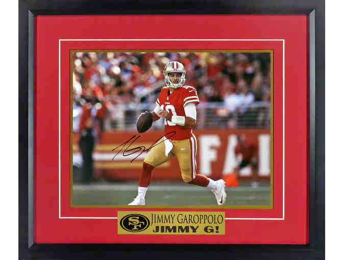 To say QB Jimmy Garoppolo made a big impression with the Niner Faithful would be a bit of an understatement. He was flat-out amazing! As everyone knows by now, the Patriots traded Garoppolo to the San Francisco 49ers on Oct. 30 of the 2017 season in exchange for the 49ers' second-round pick in the 2018 NFL Draft. And Jimmy was named the starter for the 49ers' Week 13 game against the Chicago Bears. That day, Garoppolo finished with 293 passing yards as the 49ers won 15–14 for only their second win of the season. He also earned wins in Week 14, 15, 16 and 17 against the Texans, Titans, Jaguars and Rams to go 7–0 in his first seven starts (including two starts for New England), making him the first QB to do so since Ben Roethlisberger in 2004. Put simply, the Niners are back! And they have Jimmy G to thank (which they did with a blockbuster long-term contract)! This home red 8x10 or 11x14 photo of Jimmy in action for the Niners is hand-signed by Jimmy and Sports Gallery Quality Framed w/ wood moulding, UV-protective glass (very important for signature protection!), 49ers double matting with V-Groove, and SGA Exclusive "JIMMY G!" plate. A great collectible and Sports Art from the 49ers Future! Get Jimmy's collectibles before they go up in value!