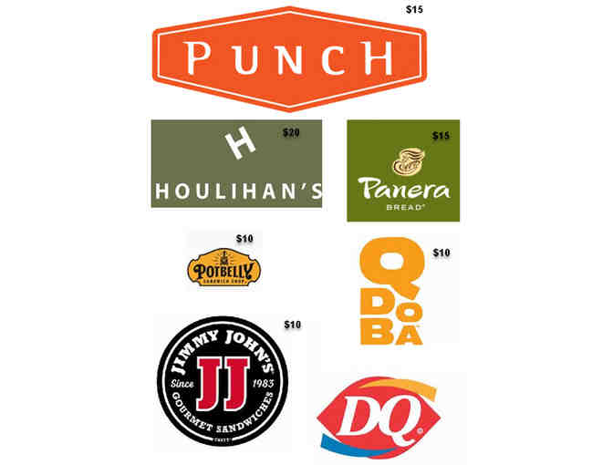 $20 Gift Certificate for Houlihan's. $15 Gift card form Punch Pizza. $15 Gift card form Panera. $10 Gift card form QDOBA. $10 Gift card from Pot Belly Sandwich Shop. $10 Gift card from Jimmy John's. Plus free stuff from DQ.