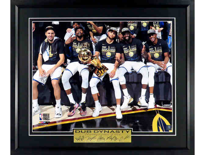 During the 2016 offseason, Kevin Durant became a Golden State Warrior. Seriously? So Curry, Thompson & Green weren’t enough of a force? A force that not only won an NBA Championship but broke the NBA Single Season record for wins in a season…73. They added Durant!? What is that saying about the “rich getting richer?” Kevin is, of course, one of the best players in basketball. Durant has won an NBA Most Valuable Player Award, multiple NBA scoring titles, NBA Rookie of the Year Award, and an Olympic gold medal. He has also been selected to too many All-NBA and All-Star teams to count. Durant is also a member of the very elite 50-40-90 Club. A prestigious Shooters Club (50% Shooting, 40% 3-pointers, 90% Free Throws) that only has seven members in this history of the NBA (and yes, MVP teammate Stephen Curry is one). And now he is on the same team as All-Stars, Olympic Gold Medalists, and NBA Champions, Stephen Curry (himself a 2x MVP!), Klay Thompson, Draymond Green and Andre Iguodala. And yes...the Dubs won it all in 2017 & 2018 (defeating LeBron & the Cavs in both Finals), with KD winning back-to-back Finals MVP honors. Can you say Dynasty…Dub Dynasty?! This awesome display perfectly celebrates the Warriors Greatness with this cool photo of Thompson, Durant, Curry, Green & Iguodala AND the trophy celebrating their 2018 Championship. This beauty is available with 11x14 or 16x20 photograph and is part of our unsigned SGA Signature Series, very cool displays that include an SGA Exclusive engraved facsimile signature Inset Plate (this one with ALL FIVE autographs!), along with "DUB DYNASTY" and "THE HAMPTON FIVE" (the nickname for this crew thanks to their recruiting trip to the Hamptons to persuade KD to join the Dubs). SGA Quality Framed with black wood moulding, glass, and deluxe V-Groove matting, this beauty is a wonderful piece of Sports Art celebrating the Warriors "Big Five" and the Championships they've brought to Dub Nation!