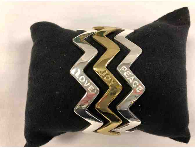 Silver and gold zig-zag bangles are engraved with the words PEACE, JOY, LOVE. Can be worn as a set or separately.