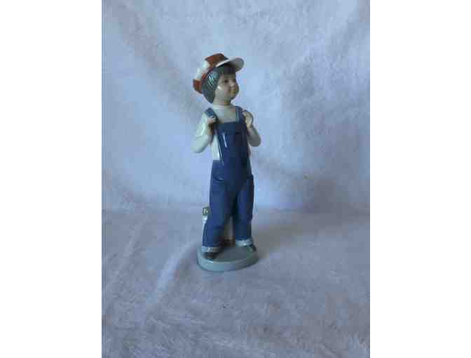 An autographed Lladro porcelain figurine titled Boy from Madrid with Accordion (#4898). The figurine depicts a young boy wearing blue overalls, a red and white cap with an accordion at his feet. The figurine is marked “Lladro Hand Made in Spain Daisa” to the underside.