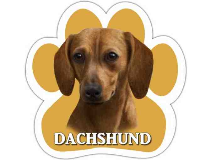 Show the world how much you love your Dachshund with this magnetic die-cut paw shaped magnet. The adorable, realistic face of the Dachshund is pictured over the paw shaped background. Each magnet has a UV coating to protect against wear and tear due to weather. The magnetic back makes this product great for your vehicle, refrigerator, locker, mailbox or any other magnetic surface. The beauty of the magnet is its easy-on and easy-off, allowing you to reposition without any damage or mess left behind. Measuring at just 5.2 inches wide and 5.2 inches tall, it’s the perfect size to let everyone know your favorite breed. This also makes a great gift idea for any Dachshund lover and owner!