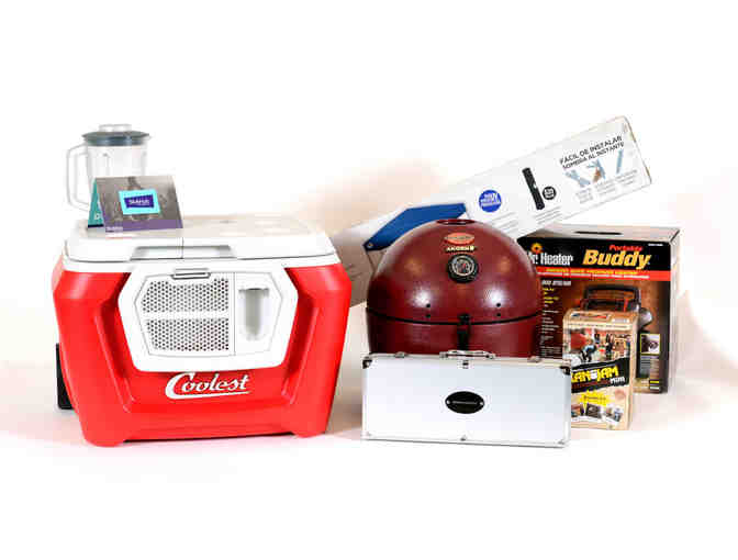- Coolest Cooler - Cooler with attached blender, bottle opener, bluetooth speaker, corkscrew, plates, cutting board and knife