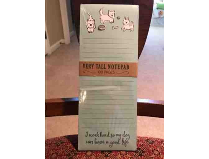 "I work hard so my dog can have a good life" very tall notepad with magnet on back for hanging, 100 pages, In kitchen or office this pad is great for loooong lists.