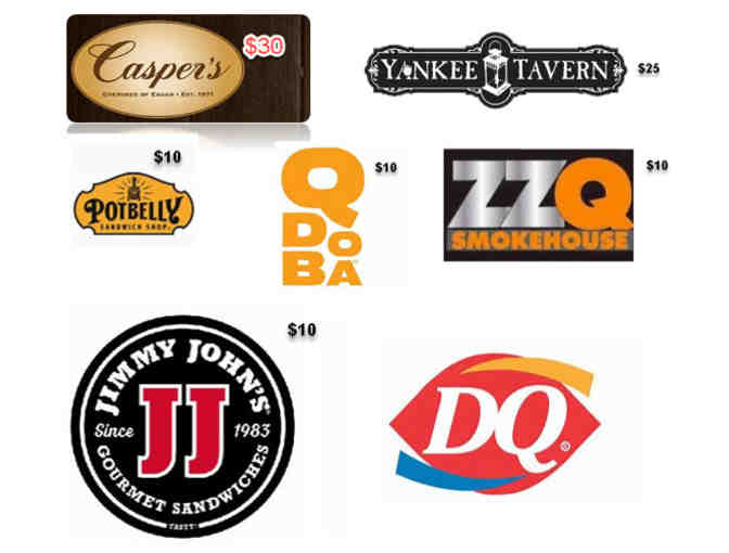 $30 Gift certificate to Casper's Cherokee of Eagan. $25 Gift certificate to Yankee Tavern. $10 Gift card to Qdoba. $10 Gift card to Jimmy John's. $10 Gift card to Pot Belly. $10 Gift card to ZZQ. Plus free stuff from DQ.