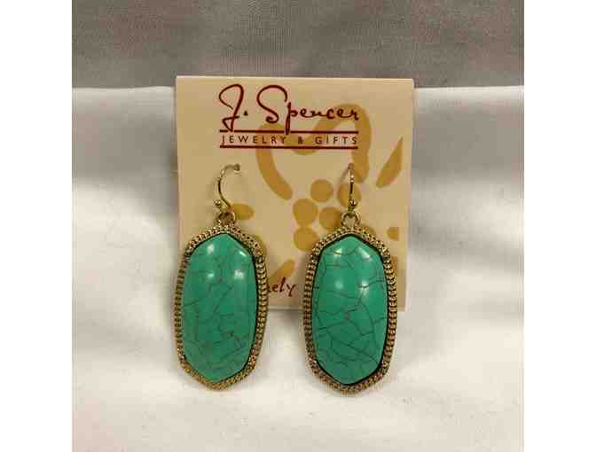 Designer-inspired large drop earrings feature a faux turquoise stone. Approximately 1.5" long and .75" wide.
