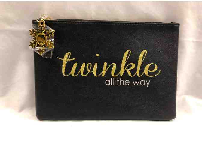 Black zip cosmetic bag is embellished with a gold snowflake zip grip and the words "Twinkle All the Way."