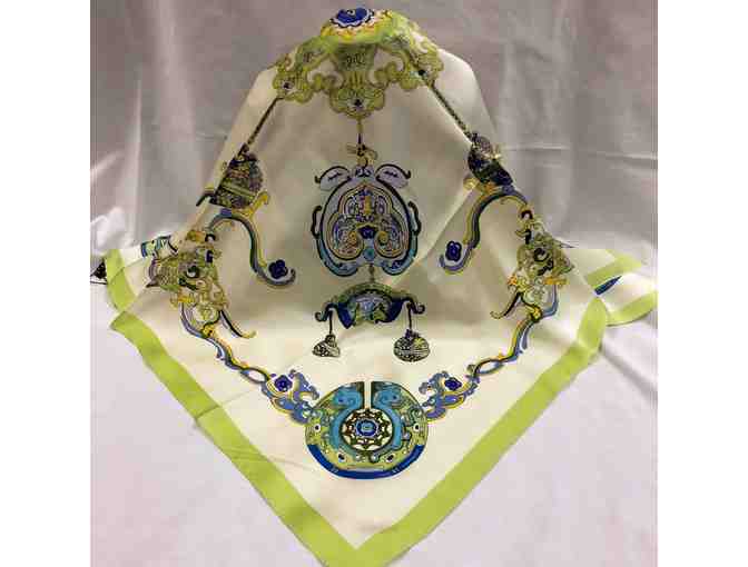 Purchased on a trip to China, this 100% silk scarf is lightweight and versatile. The rich hues of blues and greens are set on a white background. Dimensions are 35" x 35".